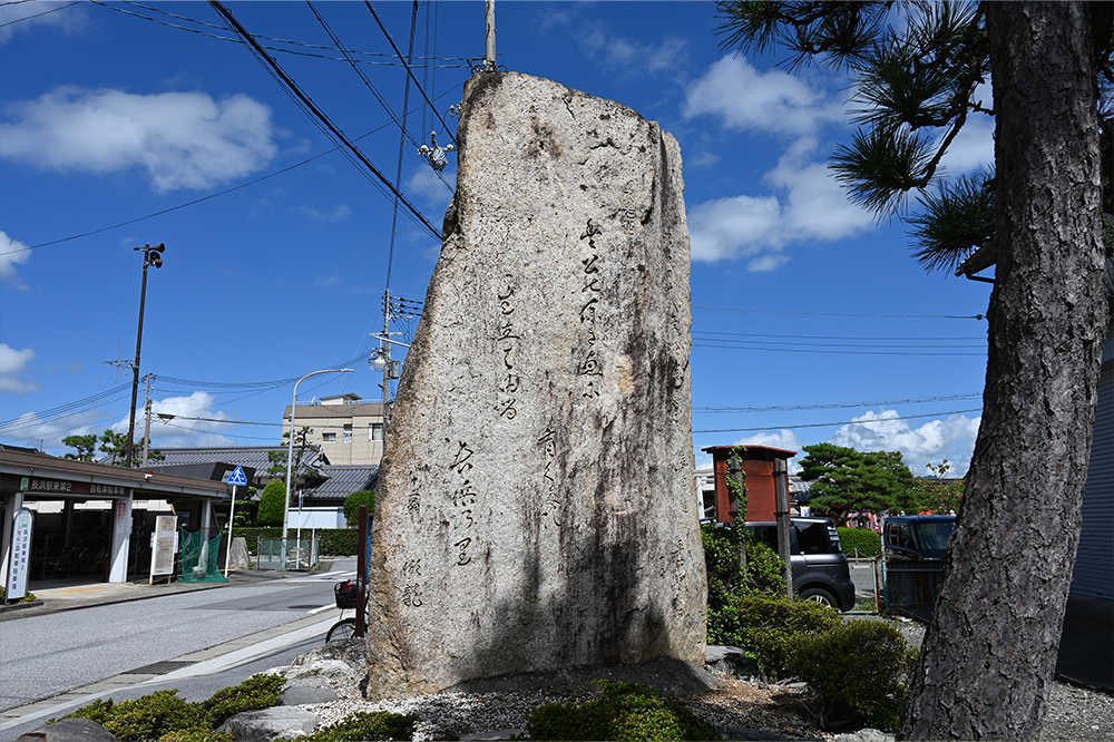 上部に「長浜開町四百年記念碑」と題字され、竹中半兵衛の子である重門が記した秀吉の一代記『豊鑑』から、「長浜真砂」の和歌を記す。和歌は「君が代も わが世も共に 長浜の 真砂のかすの つきやらむまて」とあり、「読み人知らず」。一般には信長の治世が長く続くことを望んだものとされる。昭和48年(1973)、JR長浜駅北に長浜開町400年を記念して建立された。石材は敦賀市疋田にあったもので、秀吉が「金ヶ崎の退き口」の時に隠れたという伝承がある「豊公いのちの石」を移設して使用した。裏面には「湖龍」による歌が記される。
