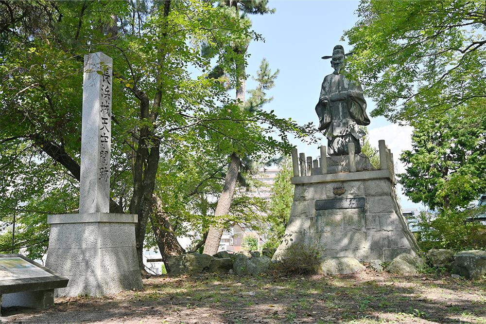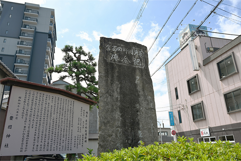 上部に「長浜開町四百年記念碑」と題字され、竹中半兵衛の子である重門が記した秀吉の一代記『豊鑑』から、「長浜真砂」の……