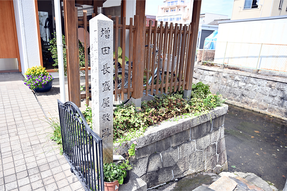 増田長盛は、豊臣秀吉の五奉行の一人として知られる。この石碑は旧マスカット珈琲店の場所に建つ。昭和51年秋に、長浜ラ……