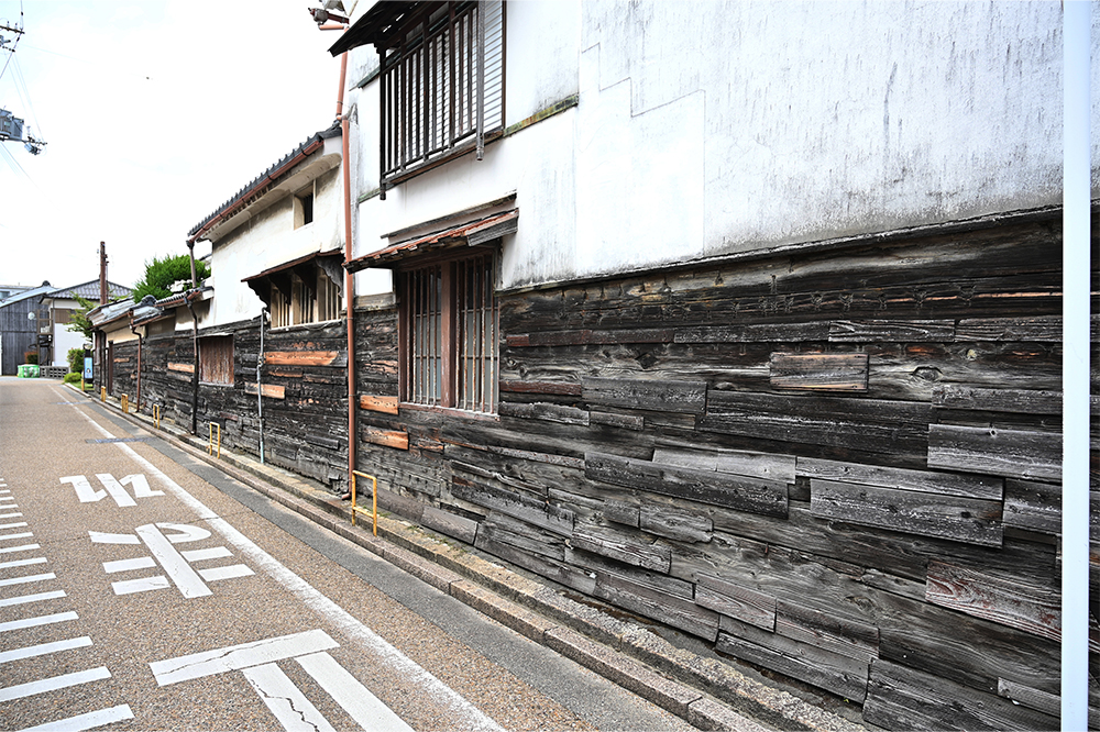 下船町から慶運館に行く道筋にある船板塀。琵琶湖の船の廃材を塀にしたものとされ、細長い部材に鎹(かすがい)の跡が残り……